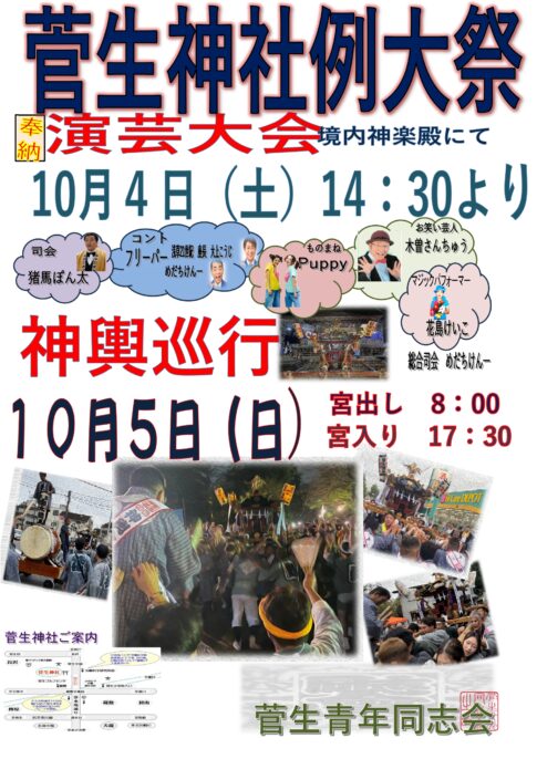 本年も菅生神社例大祭の時期がやってきました。 宮入は菅生中学校の学生も神輿を担ぎます! 是非ともご参加ください